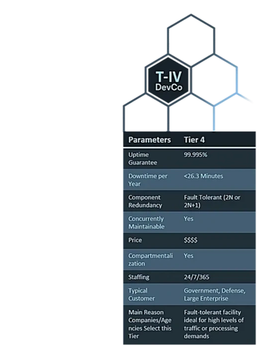Tier IV DevCo (T-IV) delivers turnkey data center, digital infrastructure, and supporting energy solutions. We pursue strategic greenfield, brownfield, and infill properties aligning with fiber and energy availability while leveraging flexible financing strategies to facilitate successful builds, long term fiscal stability, and above average ROI for our business partners.